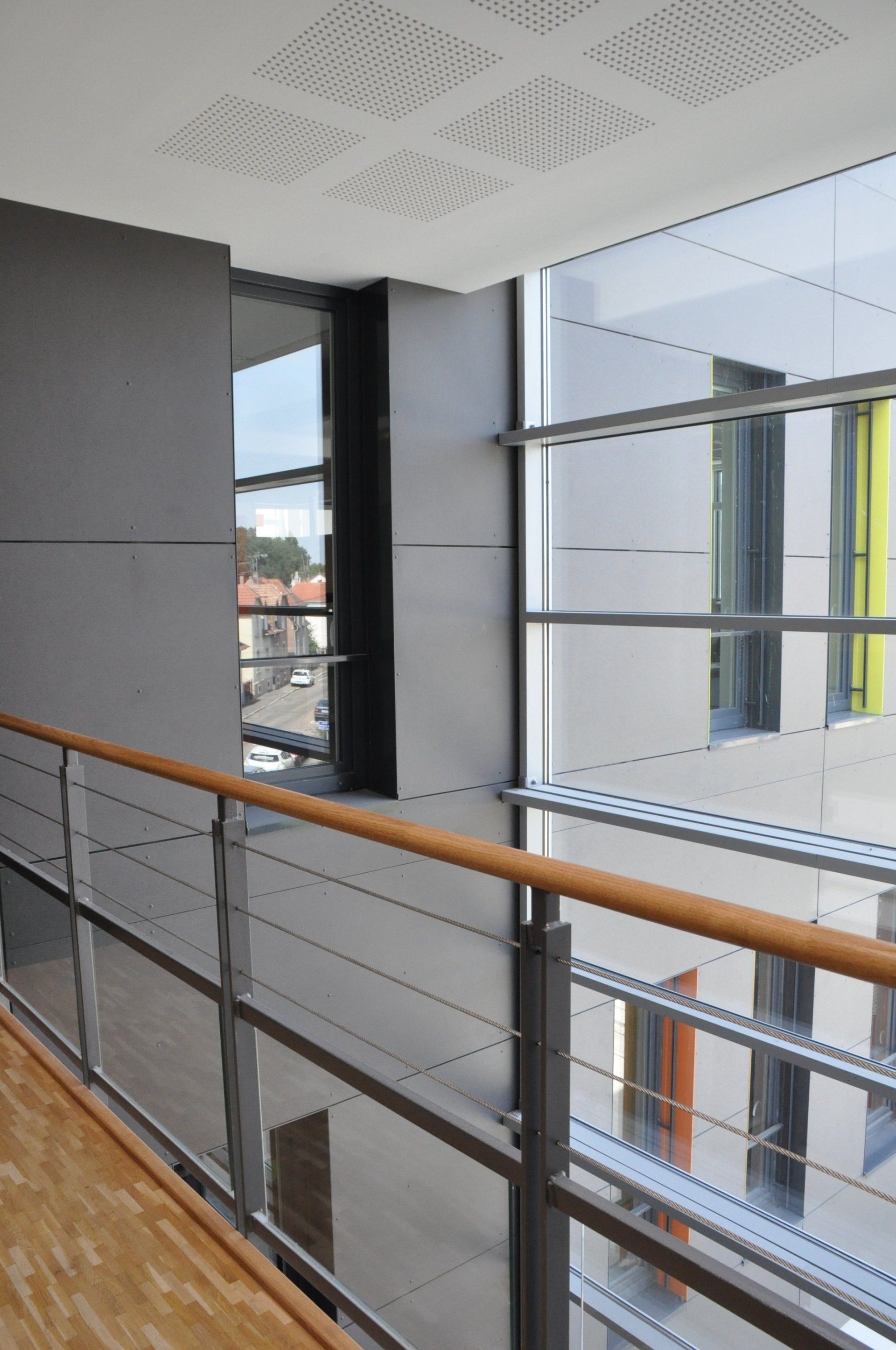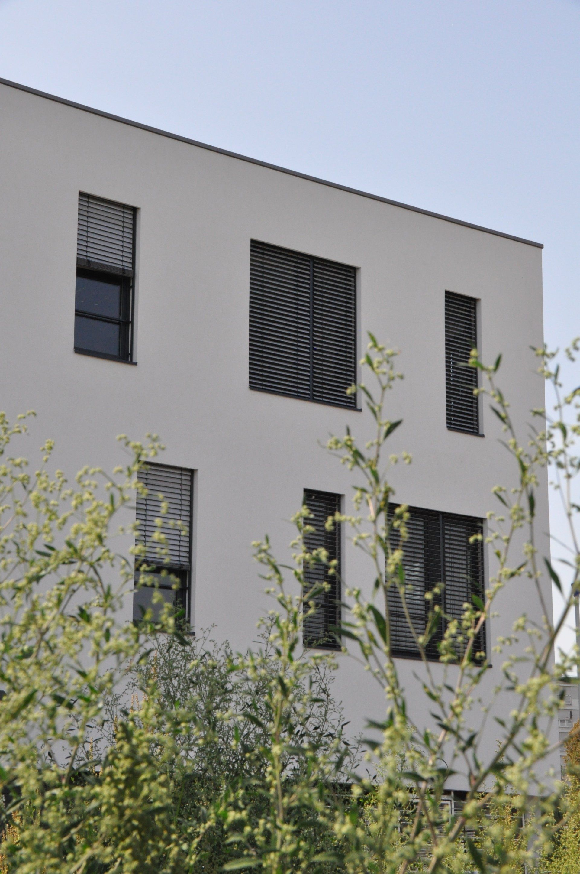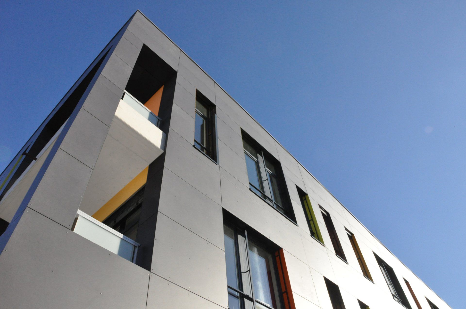 La structure et les façades porteuses en béton doublées d’une isolation par l’extérieur confèrent une forte inertie au bâtiment. Les fenêtres sont équipées de protections solaires de type brise-soleil orientables qui limitent l’échauffement en été. Les façades du volume le long de la rue d’Hochfelden sont recouvertes d’une vêture en panneaux composites d’aspect minéral de couleur gris anthracite. Les retours d’ébrasement réalisés en tôle laquée sont colorés, offrant une vibration à la façade. L’angle sur le parvis, est découpé pour offrir une terrasse sur deux niveaux : l’intérieur de cette « loggia est également réalisé en couleur plus vive.