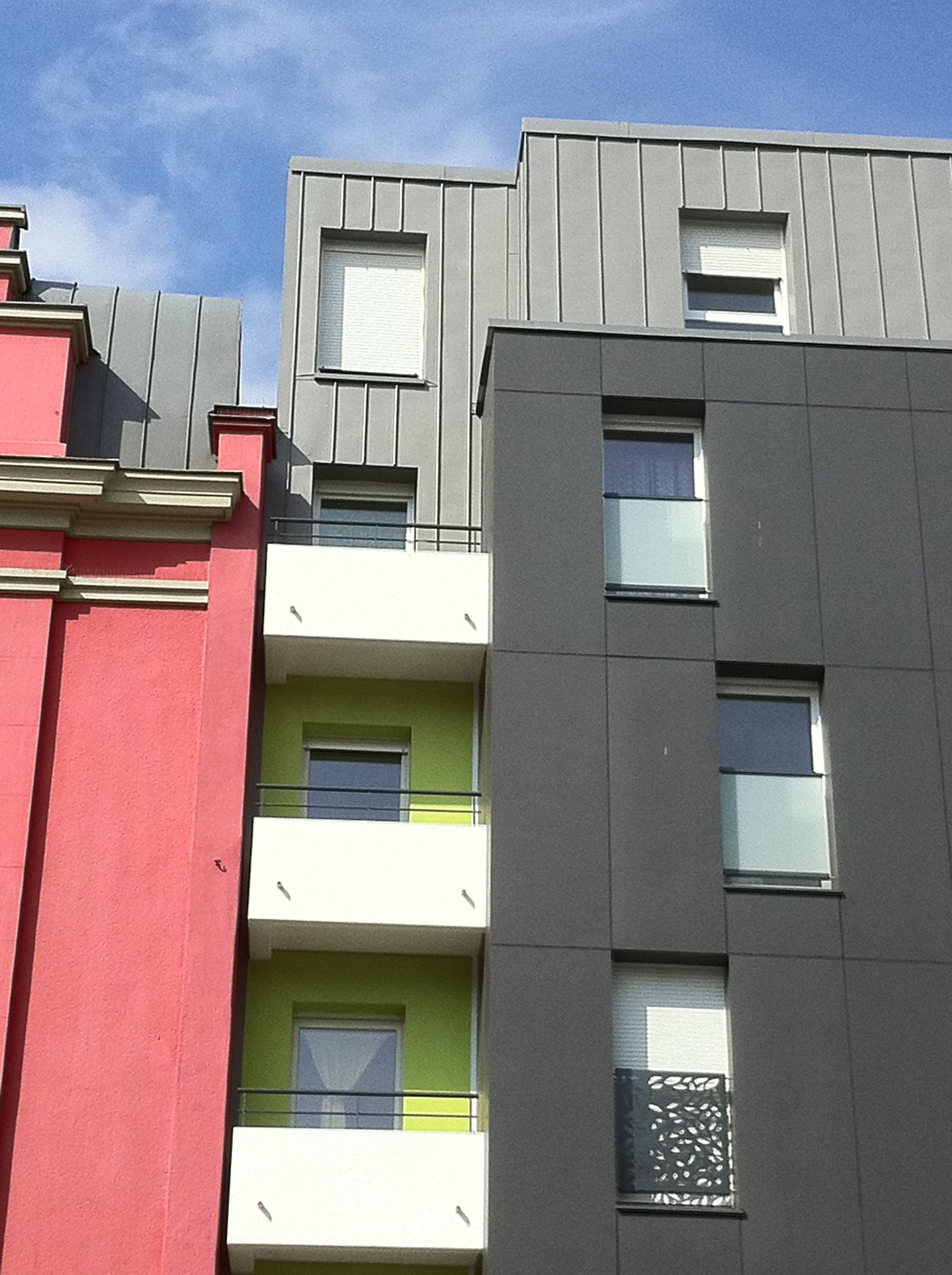 Le bâtiment est implanté sur les deux pignons en attente à l’alignement de la rue. Le RDC est doté de larges vitrines qui permettent de donner de l’importance au commerce et participent à l’animation de la rue. Aux étages, l’expression d’un oriel avec une façade très structurée renforce la géométrie des bâtiments existants. La façade sur cour accueille de grands balcons avec séchoirs.