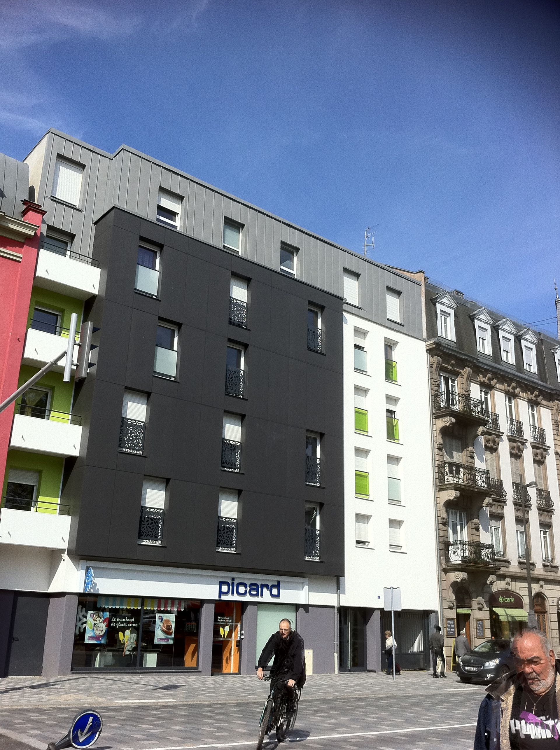 Le projet s’inscrit dans un environnement urbain, au cœur du Neudorf, Route du Polygone, face à la place du marché. Le projet comprend la construction de 14 logements locatifs aux étages et d’un local commercial de 240m² au RDC.