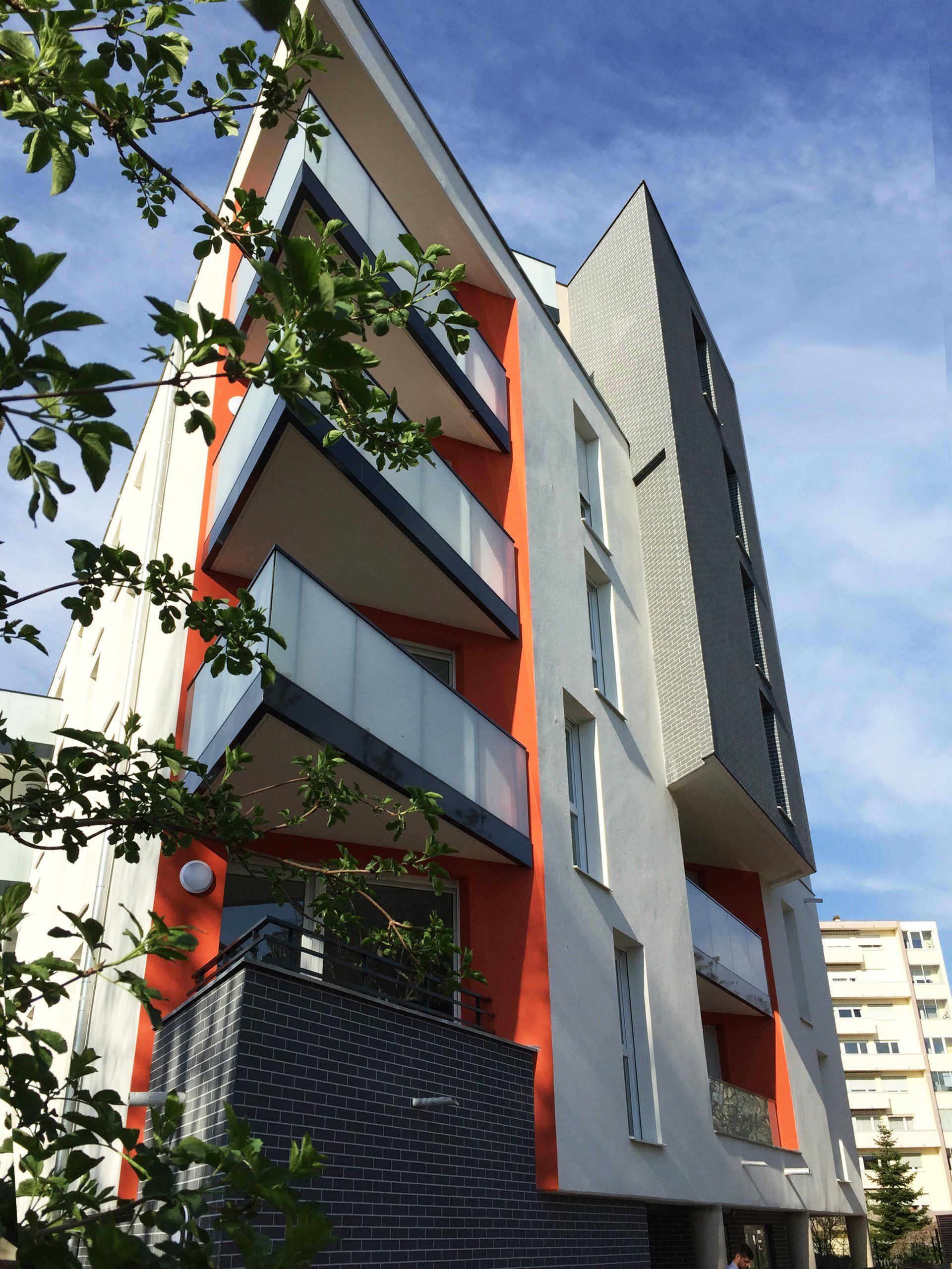 La forme triangulaire du terrain et la faible emprise, déterminée par les règles de prospect, génèrent un ensemble assez inhabituel. Le RDC, dédié aux parties communes, est traité comme un sous-bassement partiellement en retrait. Quatre étages droits occupent toute la surface disponible du triangle constructible à l’exception de l’angle Sud-Est, laissé libre pour dégager l’espace à proximité de la cour d’école voisine et y maintenir un ensoleillement optimal. L’angle aigu au Sud-Ouest est traité en balcon créant un effet dynamique. Cette dynamique basée sur le triangle, se retrouve sur les loggias et balcons en façade Sud. L’ensemble est couronné de deux étages en double-attique, implantés en retrait sauf sur la rue du Rieth où le volume redescend en avant-corps.