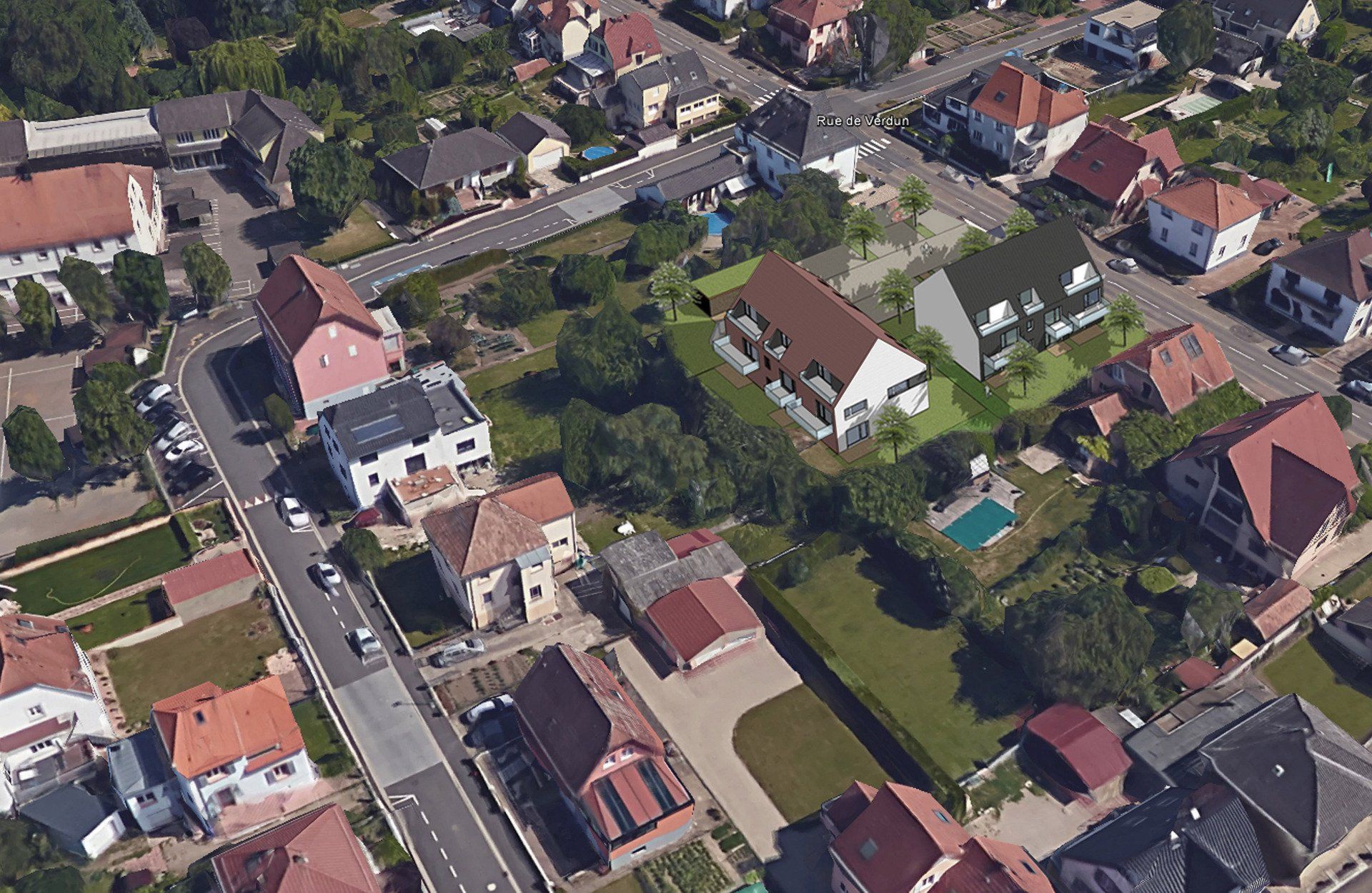 Le site du projet est fortement marqué par un tissu de maisons individuelles diffuses implantées en bordure de voie et dégageant des intérieurs d’ilots paysagés : pelouses, piscines, jardins potagers forment autant de prolongements extérieurs aux logements qui bénéficiaient d’une certaine intimité et tranquillité.