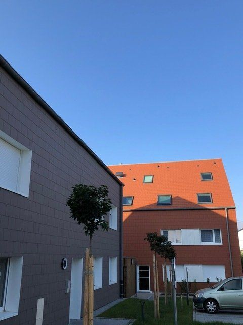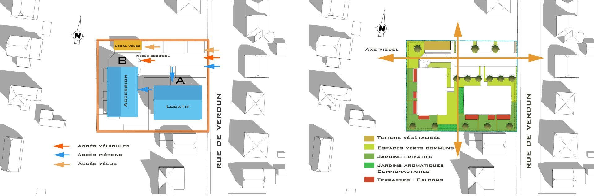 Un premier bâtiment s’oriente perpendiculairement à la rue, offrant des orientations sud à ses neuf logements : le pignon sur rue évite une trop grande fermeture et maintient une certaine perméabilité sur l’intérieur d’ilot, il offre une échelle identique à l’épannelage existant de la rue. Un second bâtiment s’implante en second rang, perpendiculairement. Il oriente ses logements au sud et à l’ouest pour préserver leur intimité. Cette disposition évite toute les vues directes sur les terrasses ou balcons privatifs et permet d’ « orienter sans exposer ». Chaque construction comporte trois logements par niveau, qui bénéficient d’orientations favorables et traversantes. Les logements en comble sont réalisés en duplex.