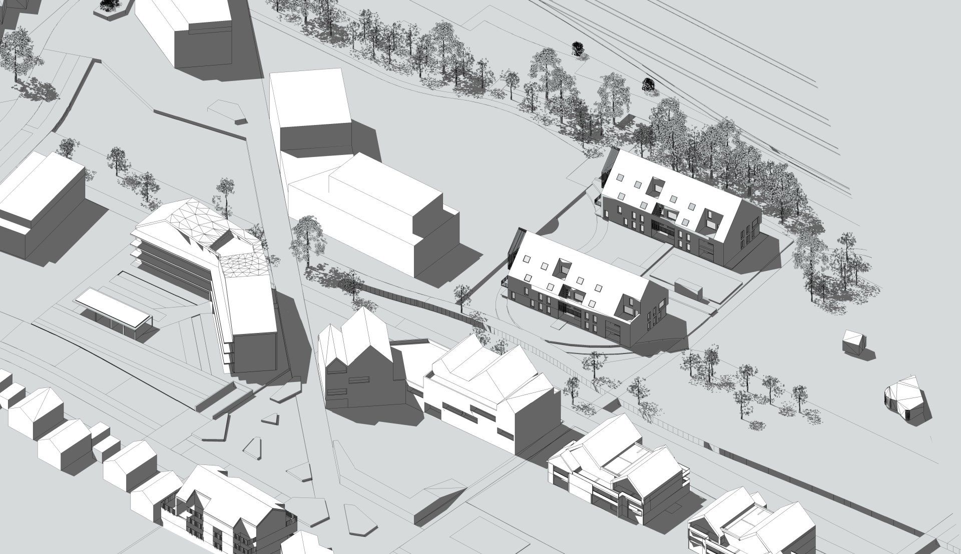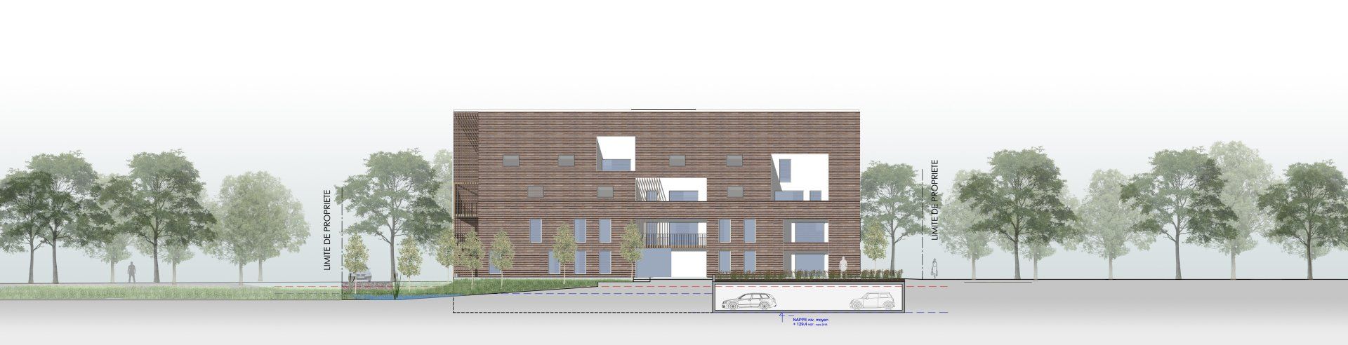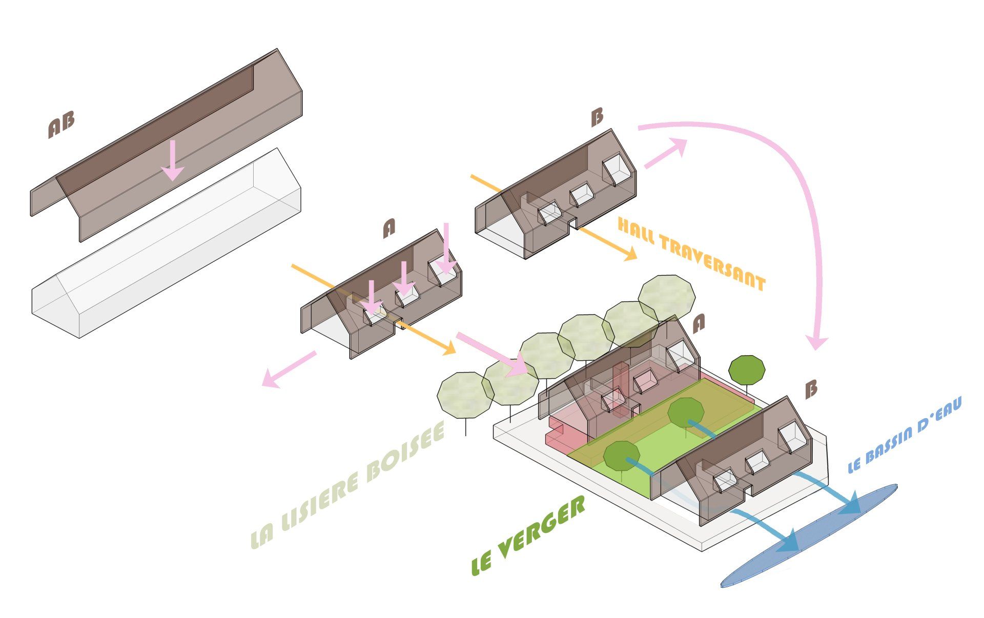 Le terrain de l’opération se situe en limite de frange boisée, en zone inondable. L’opération est répartie en deux bâtiments de 15 logements chacun, de gabarit R+1+2C, rappelant la morphologie courante des habitats traditionnels et des granges agricoles présentes à la Wantzenau : deux niveaux droits sous un large toit continu et enveloppant. Les deux bâtiments organisés en fronts successifs, orientent les logements sur le bassin paysager et le verger qui prend place en cœur d’ilot.