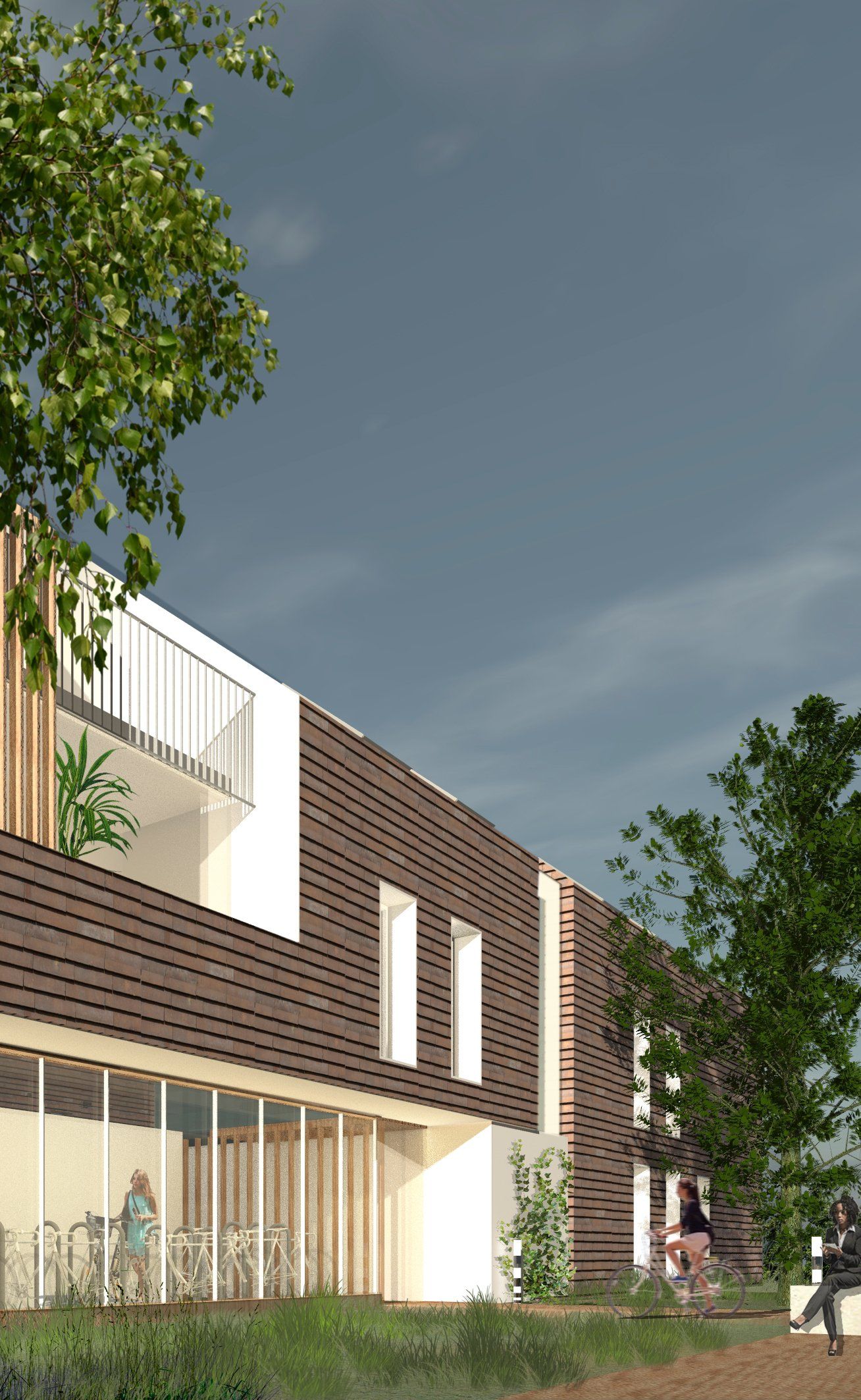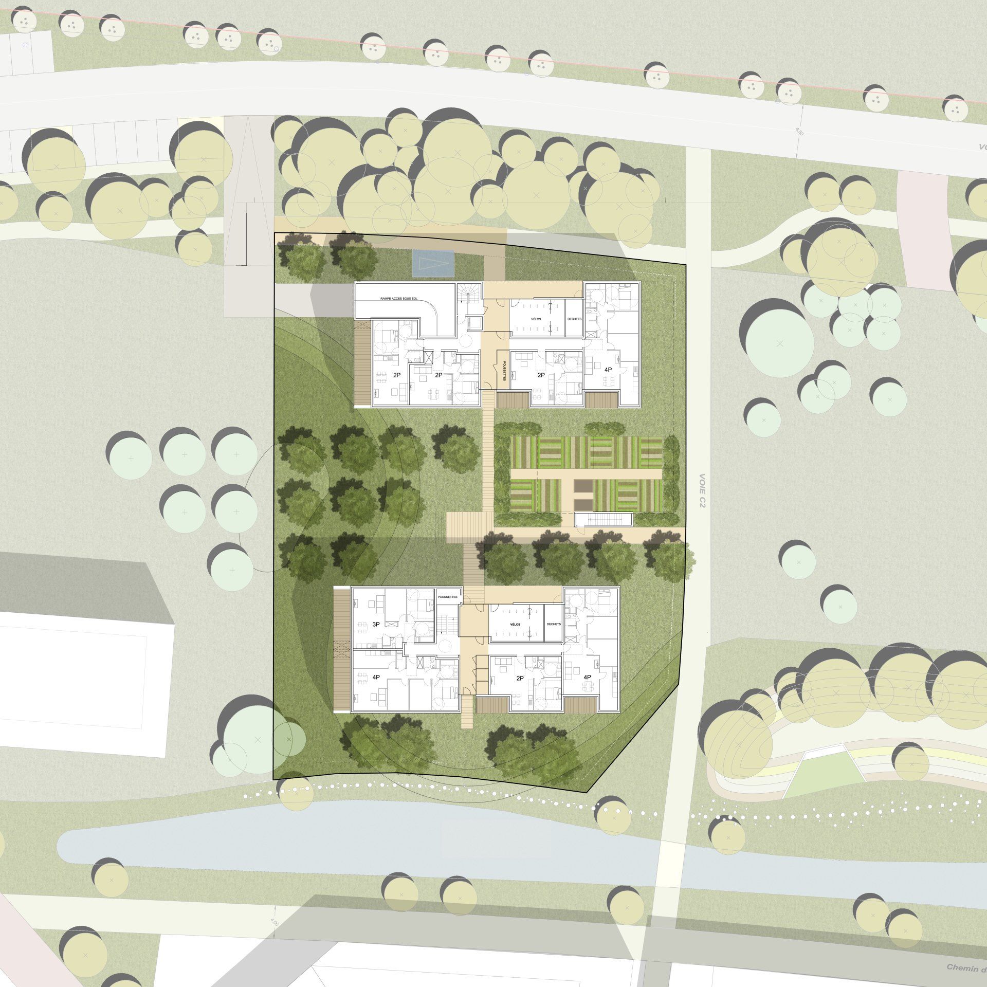 Les espaces extérieurs s’organisent trois strates successives : la lisière nord-ouest bordée d’arbres, le cœur de la résidence accueillant vergers et jardins potagers et le prolongement du bassin paysage qui se présente comme un espace paysager ouvert et d’agrément visuel. Les espaces jardinés seront conçus en partenariat avec le bailleur et les futurs locataires, dans une démarche de co-conception.