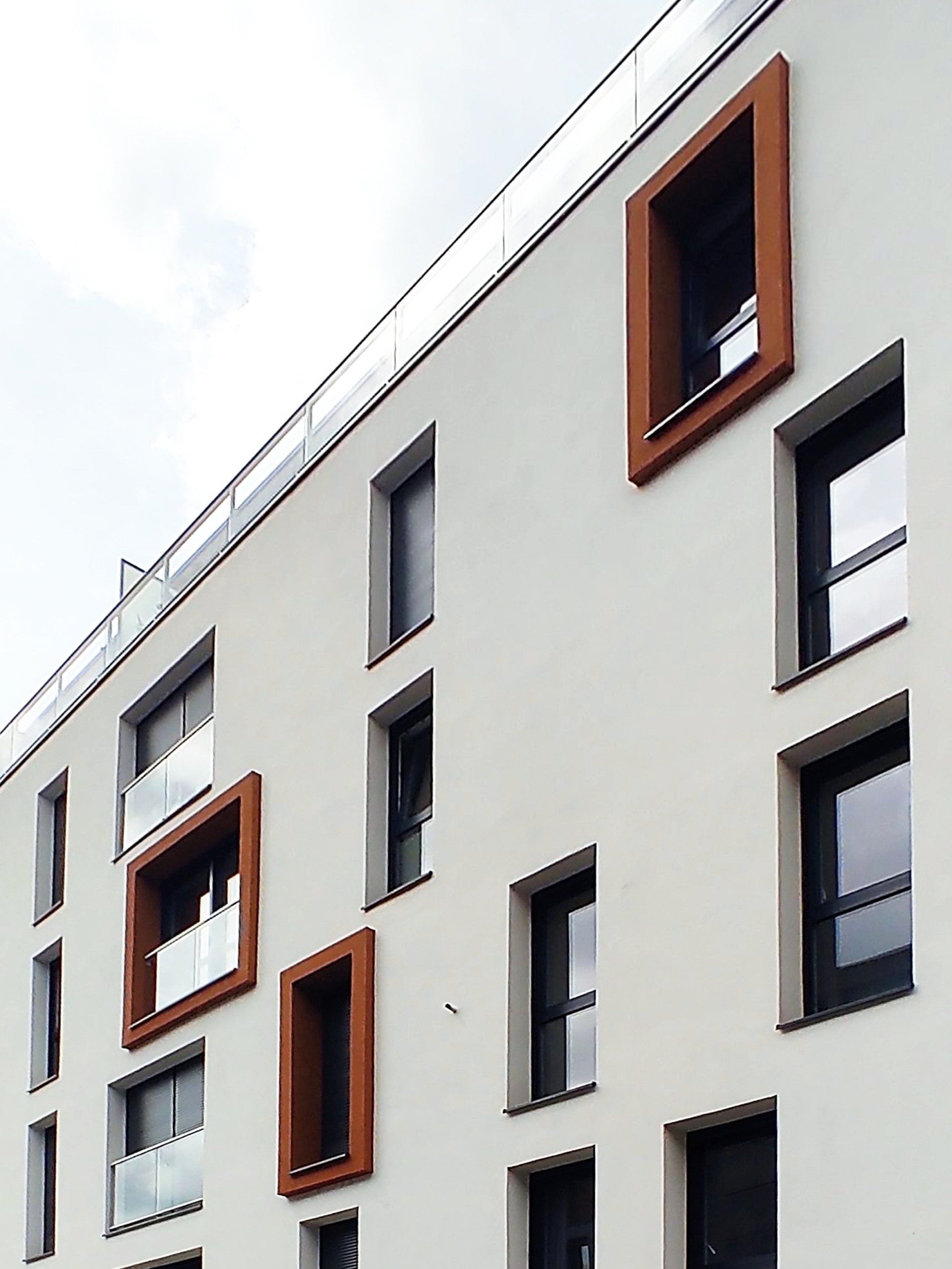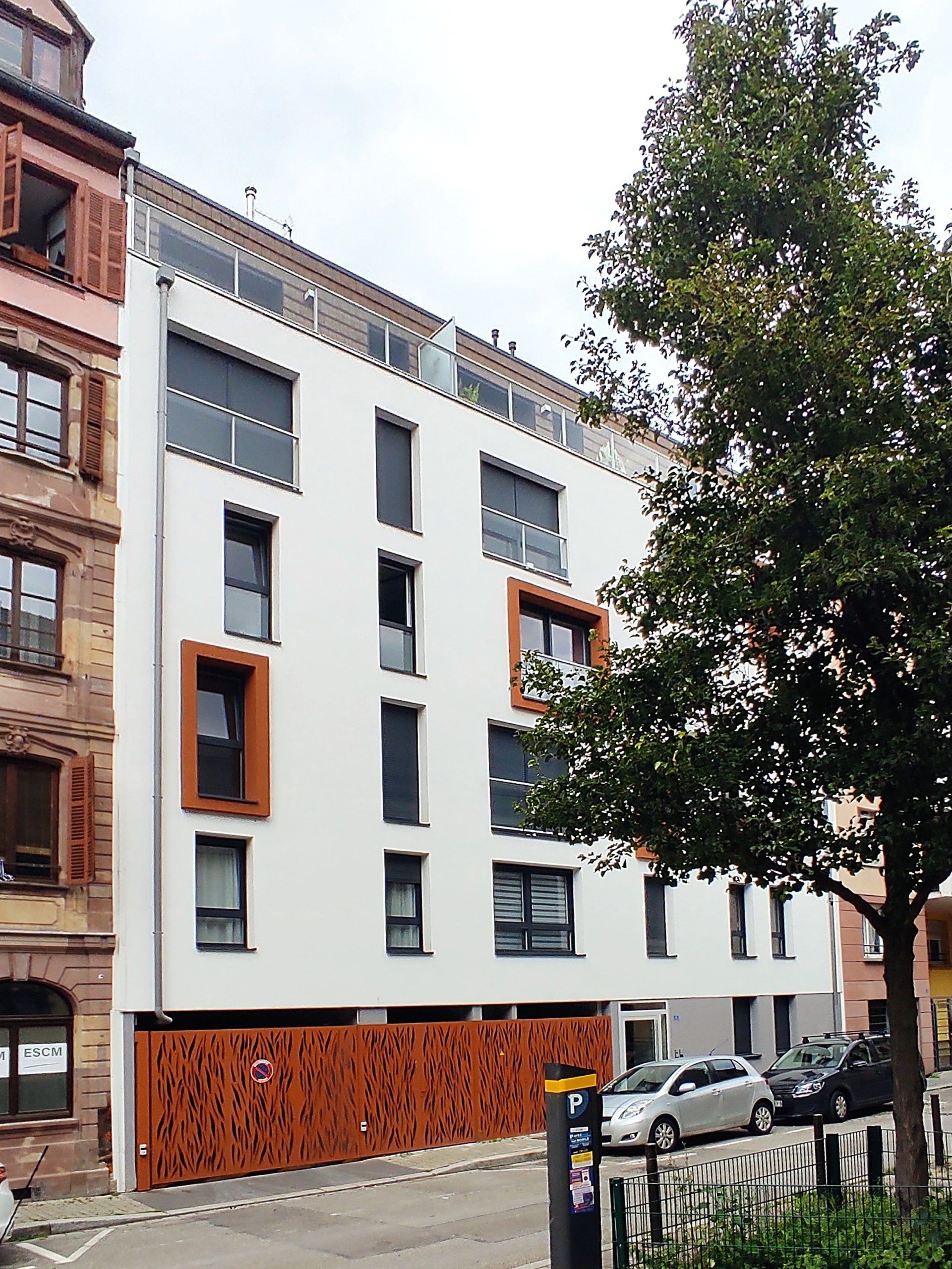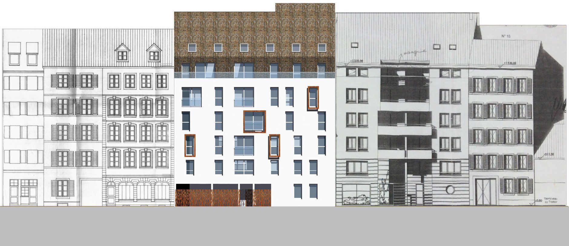 Le projet consiste en la construction d’un immeuble de 16 logements dans une dent creuse du quartier de la gare. Le site était auparavant occupé par un bâtiment datant du début du 20ème siècle, d’usage mixte et partiellement désaffecté. Le projet s’élève sur 7 niveaux et s’organise autour d’une cour pavée végétalisée. Il accueille un niveau de stationnements en sous-sol. Le vocabulaire utilisé réinterprète l’architecture traditionnelle : tuiles plates en toiture, et façade en métal ouvragé au RDC, en rappel de l’occupation artisanale précédente.