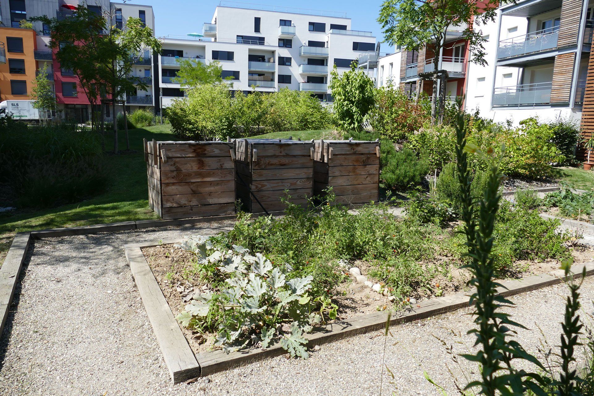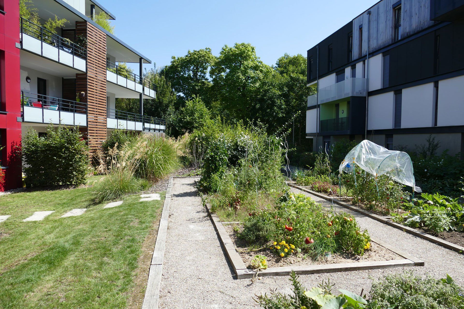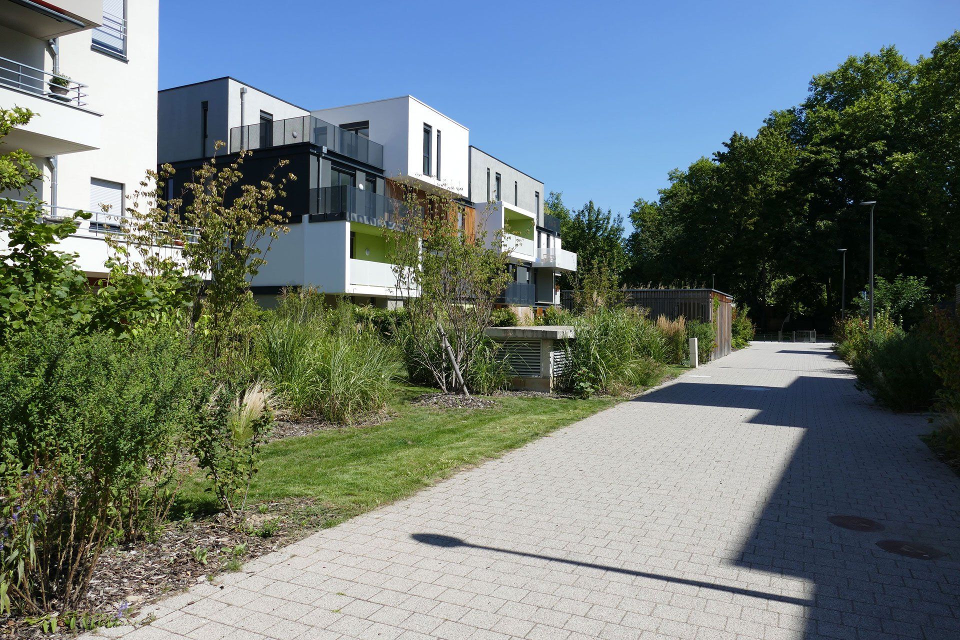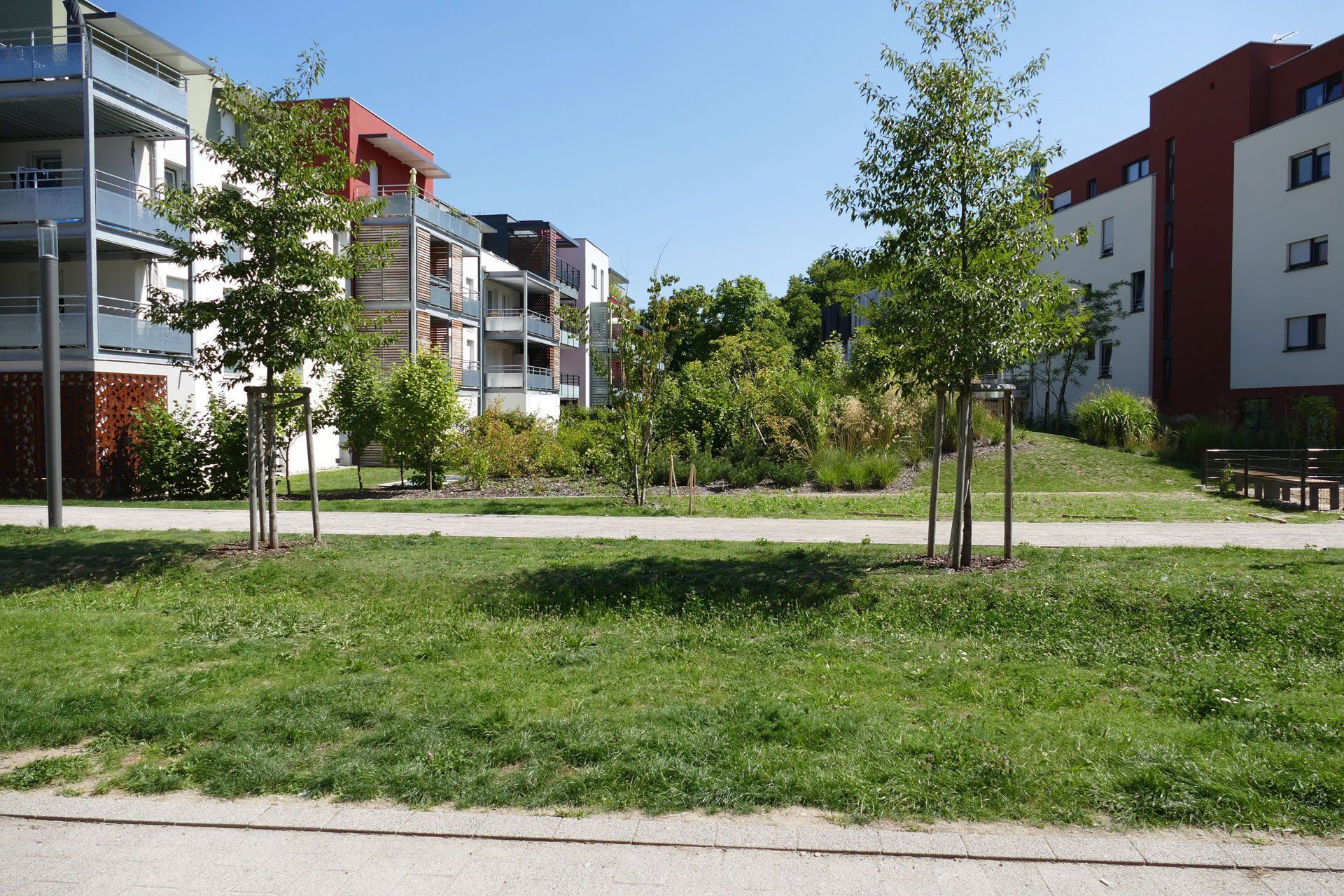 Les espaces paysagers, traités qualitativement à l’échelle du quartier, répondent autant aux besoins collectifs qu’aux besoins individuels. Leur conception s’est organisée autour de trois types d’espaces. Le parc St. Sauveur est valorisé par les arbres anciens et l’église (patrimoine bâti de la fin du XIXème siècle). Les espaces verts de l’ilot central s’ouvrent vers le parc St Sauveur et accueillent jardins privatifs et jardins partagés. Un espace de partage au cœur du nouveau quartier, l’espace vert central, accueille une promenade, la noue et les aires de jeux.