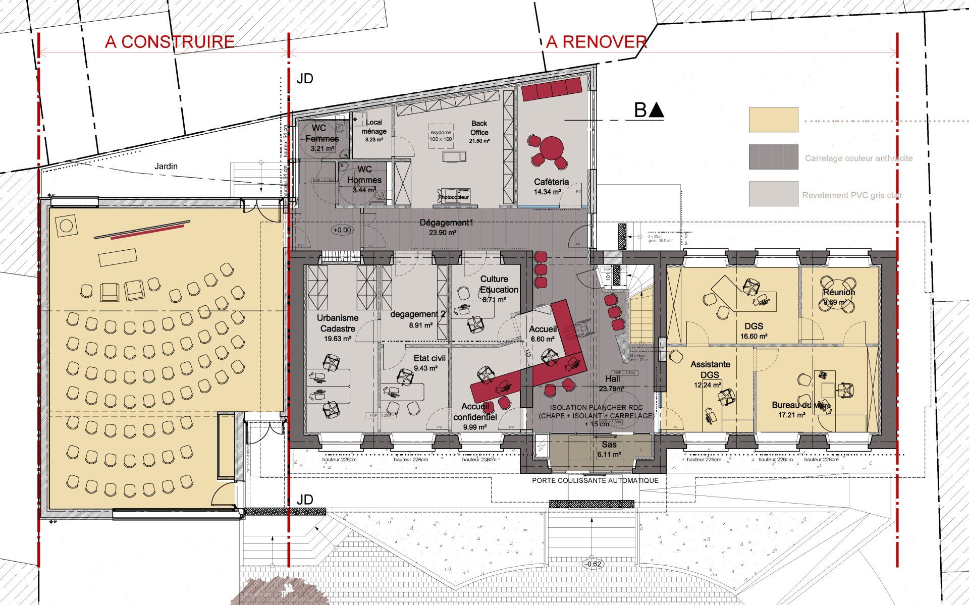 A l’occasion du projet, les façades de la mairie ont été entièrement refaites. Le volume en avant corps a été modifié : le pignon du volume central en saillie a été retravaillé pour le rendre plus contemporain en supprimant la toiture débordante et en la remplaçant par un cadre en zinguerie qui se déroule et accompagne la parcours d'entrée latérale. Des brise-soleils orientables horizontaux fixes ont été installés au RDC de l’extension et sur l’avant corps central à l’étage. Les tuiles ont été entièrement remplacées par des tuiles de teinte anthracite afin d’affirmer le caractère unitaire et institutionnel du parvis. L’espace public a également été réaménagé.