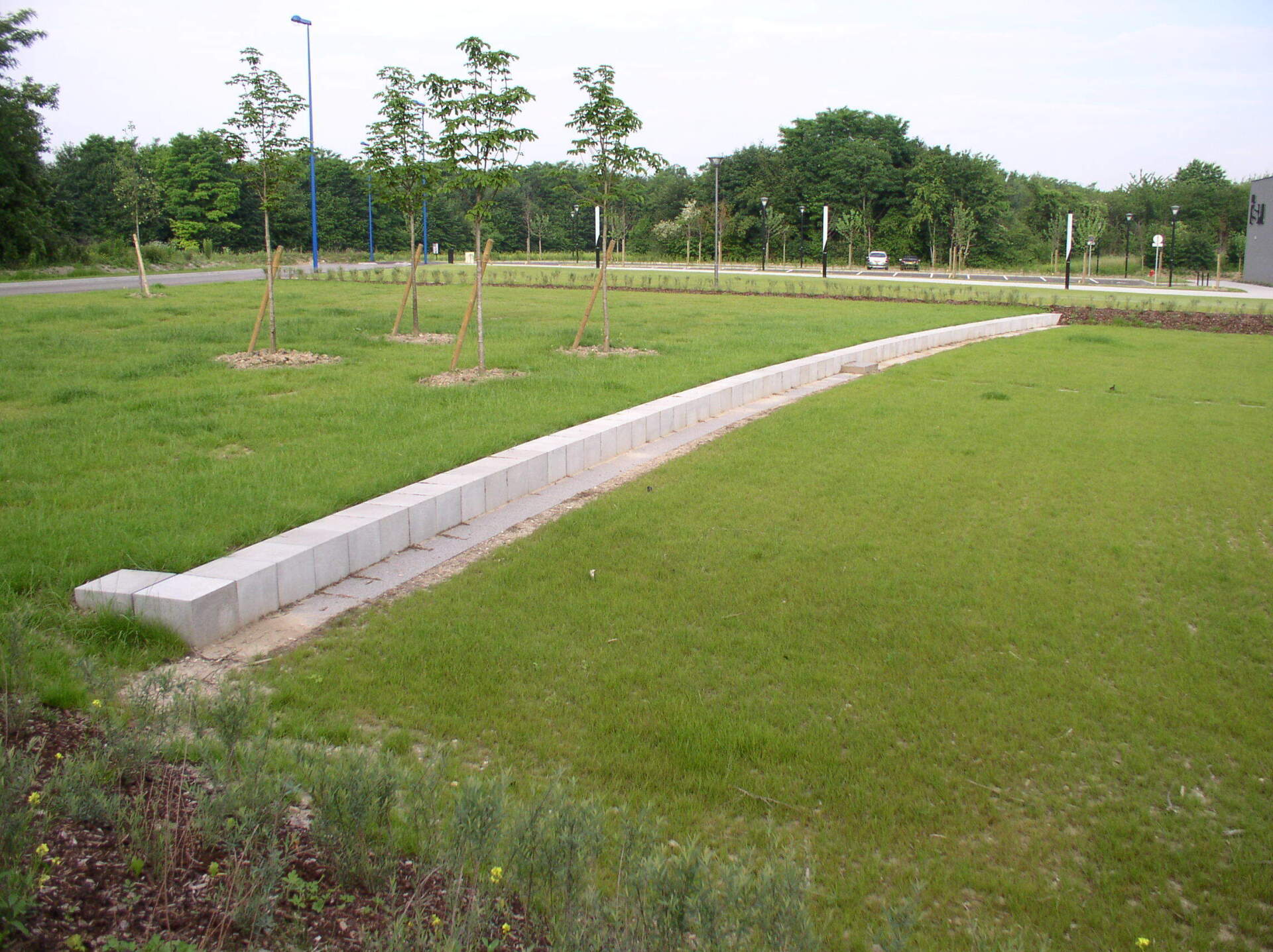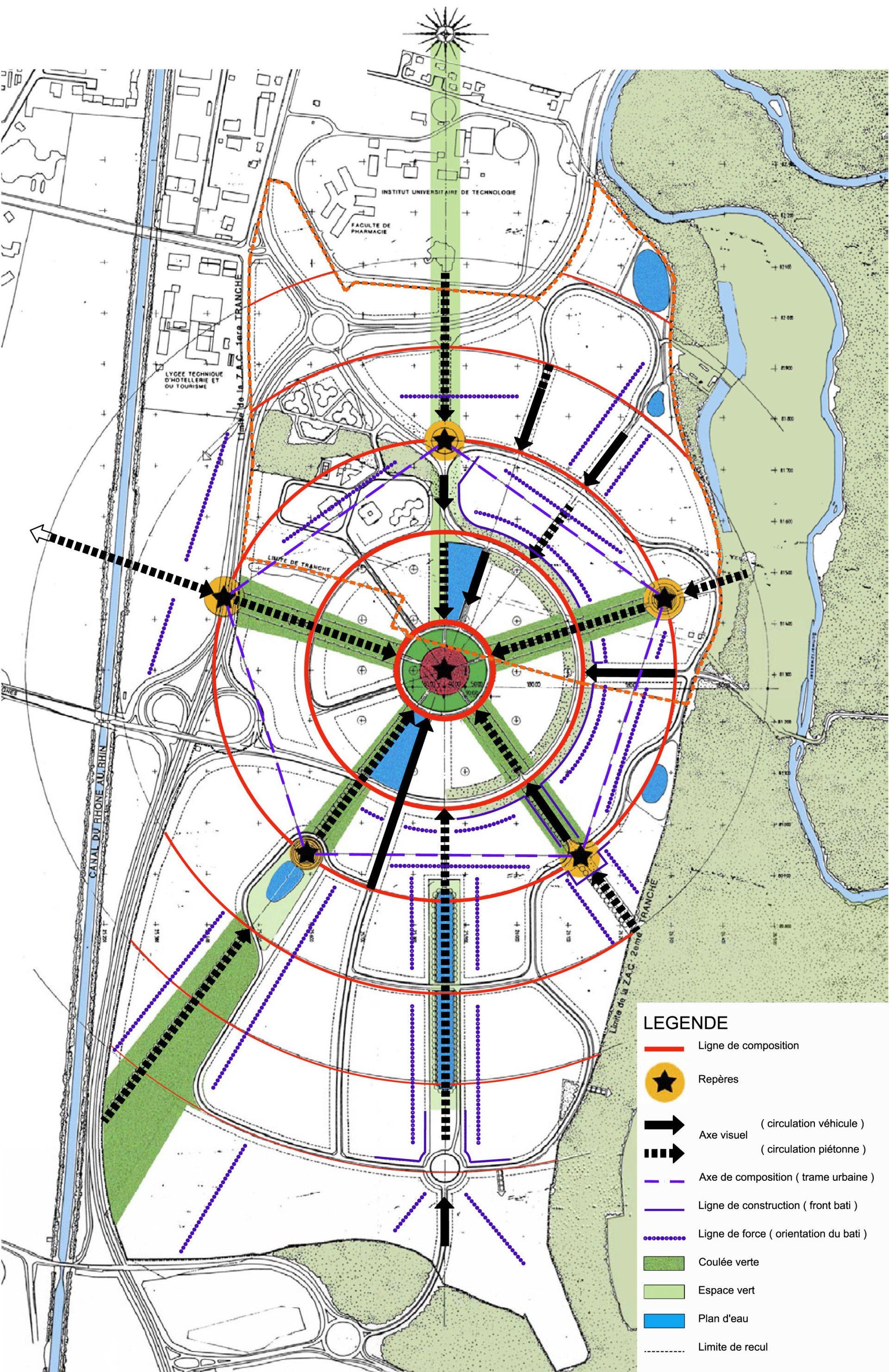 Le projet est basé sur un tracé régulateur support de la géométrie du domaine public et des implantations de bâtiments. Des cercles concentriques commandent le tracé. Cinq rayons disposés suivant un pentagone régulier correspondent aux axes des coulées vertes qui subdivisent l’espace. Les directions recouvrent alternativement des routes, des chemins, des espaces naturels aménagés. Cinq points particuliers délimitent l’espace central du Parc d’Innovation en fixant les sommets d’un pentagone régulier. Intégrés au domaine public, ils sont traités de manière spécifique. Les côtés du pentagone apparaissent comme des axes visuels qui servent de support pour une trame orthogonale propre à chaque secteur. Le centre enfin, apparait comme un espace de rencontre et de communication. Ce sera un lieu de détente et de loisirs, traité en parc urbain. Le but du tracé régulateur n’est pas d’imposer des lignes de force surabondante, mais au contraire, à travers des rappels discrets, d’aboutir à un rythme et une harmonie présente dans l’ensemble du parc.