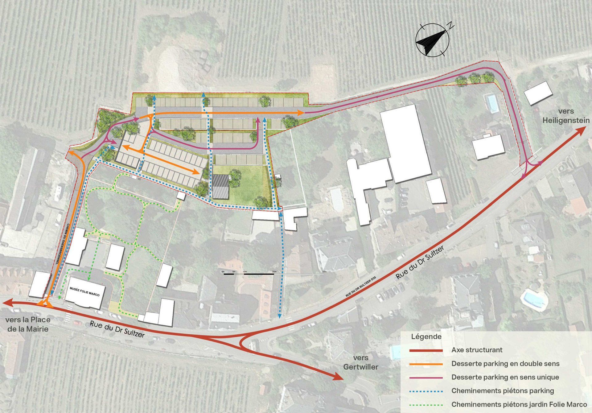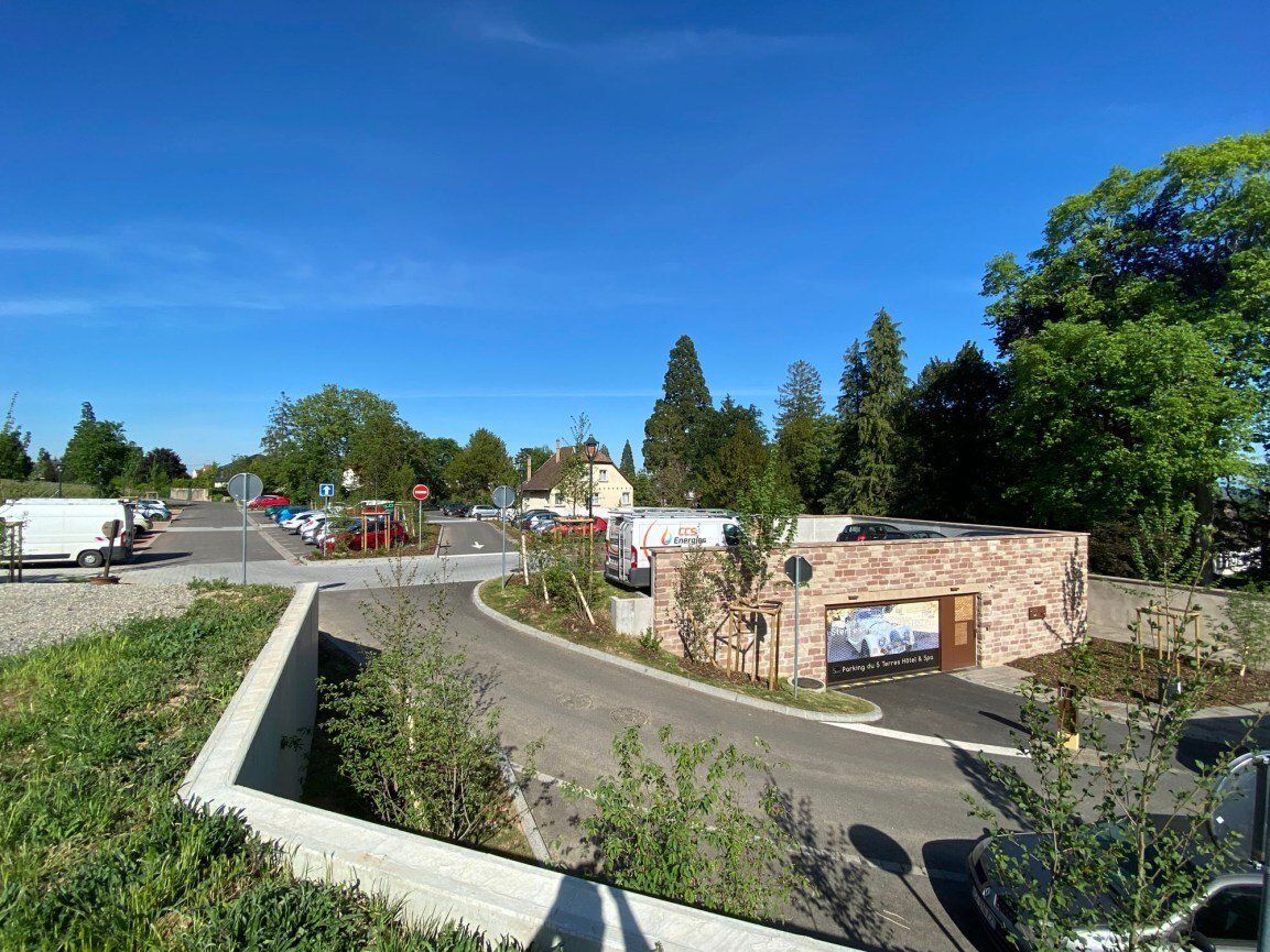 Le projet consiste en la réalisation d’un parking semi-enterré et d’un parking a en surface pour la ville de Barr. Il accueille au total 125 places. Le projet est situé sur le site d’une ancienne friche viticole, à l’arrière du Musée de la « Folie Marco » et de son parc, au pied d’un coteau viticole. Le terrain est marqué par une forte pente.