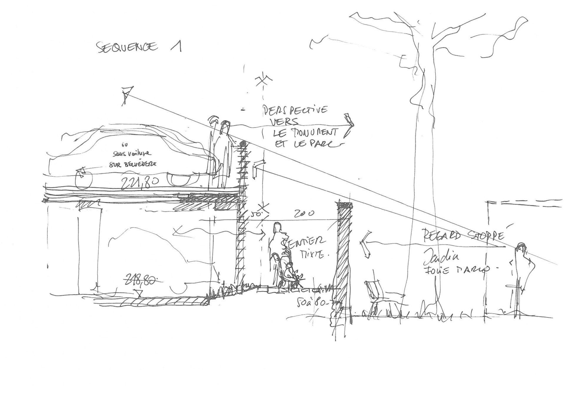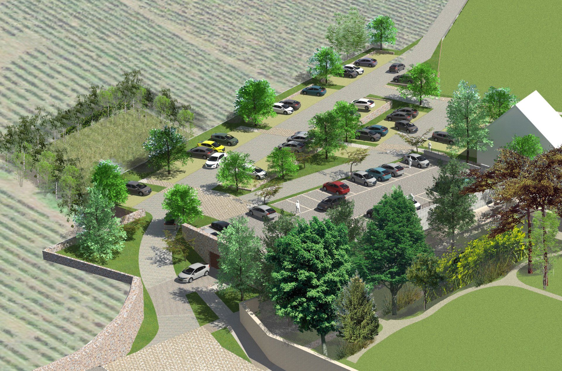 Le parking s’organise en 4 zones de stationnement. La première est constituée par un ouvrage semi-enterré en bas du terrain derrière le mur de la Folie Marco. Celui-ci n’est que très peu visible depuis le parc ou le musée du fait de l’importante végétation existante. La seconde zone s’étend au-dessus de l’ouvrage enterré et est recoupée en deux secteurs par un escalier qui rejoint le chemin longeant le parc de la Folie Marco. Une troisième espace longe le coteau viticole : parc paysager de forme assez linéaire, il est recoupé par des circulations transversales piétonnes accompagnées de trames végétales. Le long de sa limite extérieure, longeant le coteau viticole, les places sont traitées en stabilisé et des plantations viennent réduire l’impact visuel depuis le vignoble. La dernière zone est un parc en terrasse basse qui suit la pente générale du terrain et permet un bouclage de la circulation.
