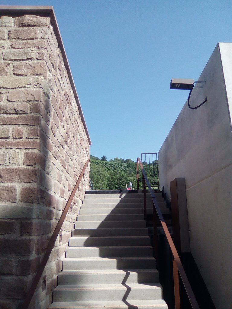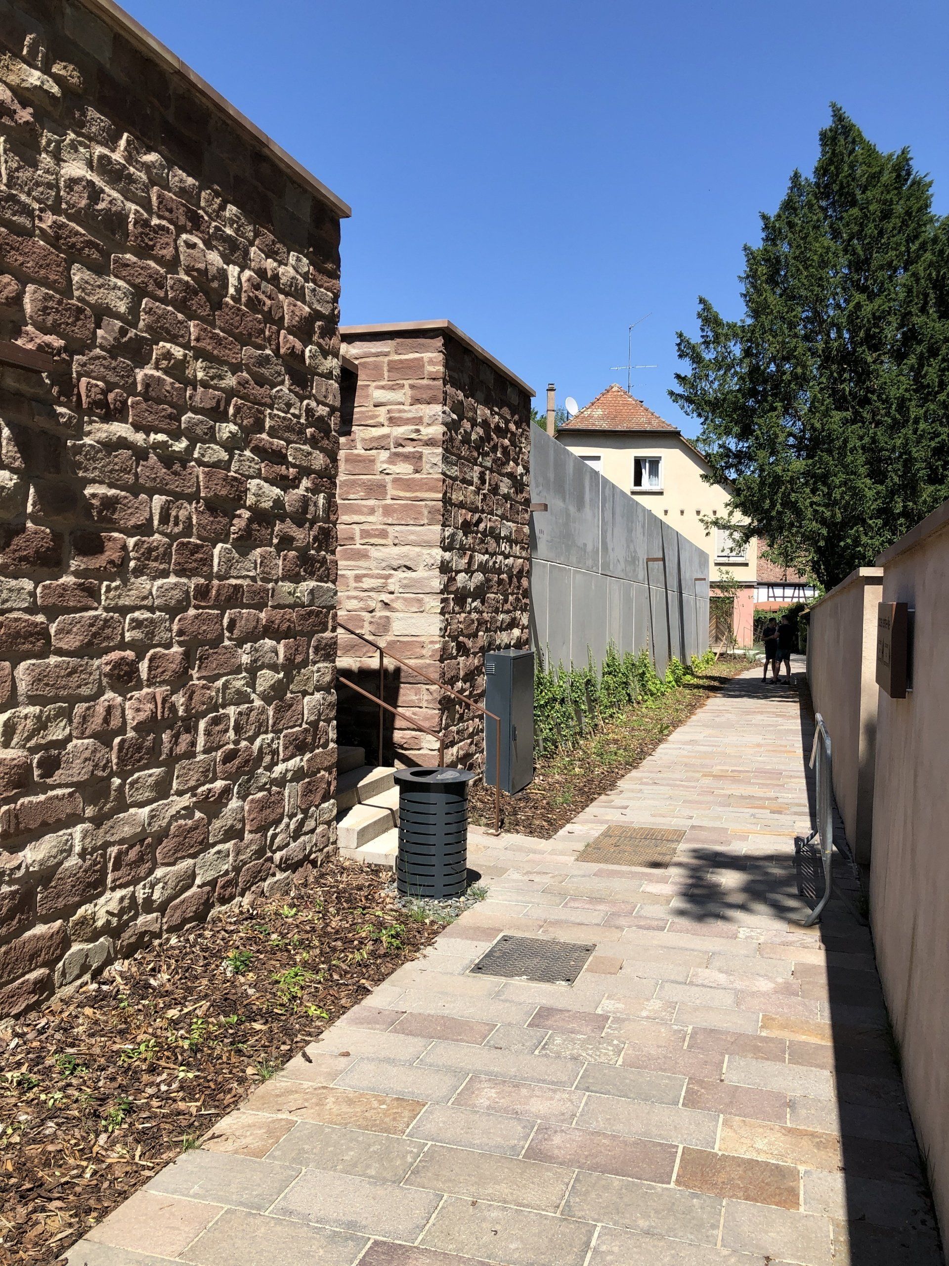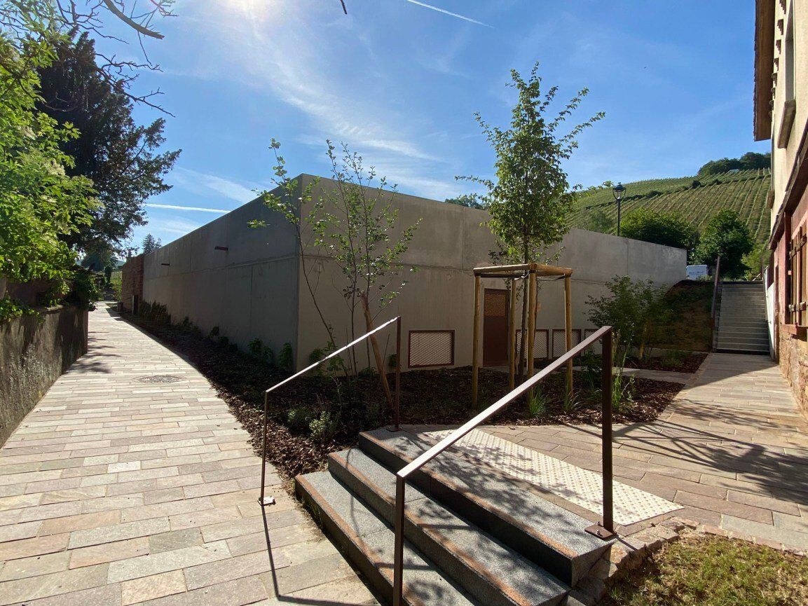 Le projet s’organise en plateformes qui s’inscrivent dans la pente naturelle du terrain. Les dénivelées entre les plateformes sont réalisées par des soutènements de moellons de grès et un talutage plantés de vignes et charmilles. Les végétaux ont été choisis dans des essences locales rappelant les thématiques viticole ou fruitière.