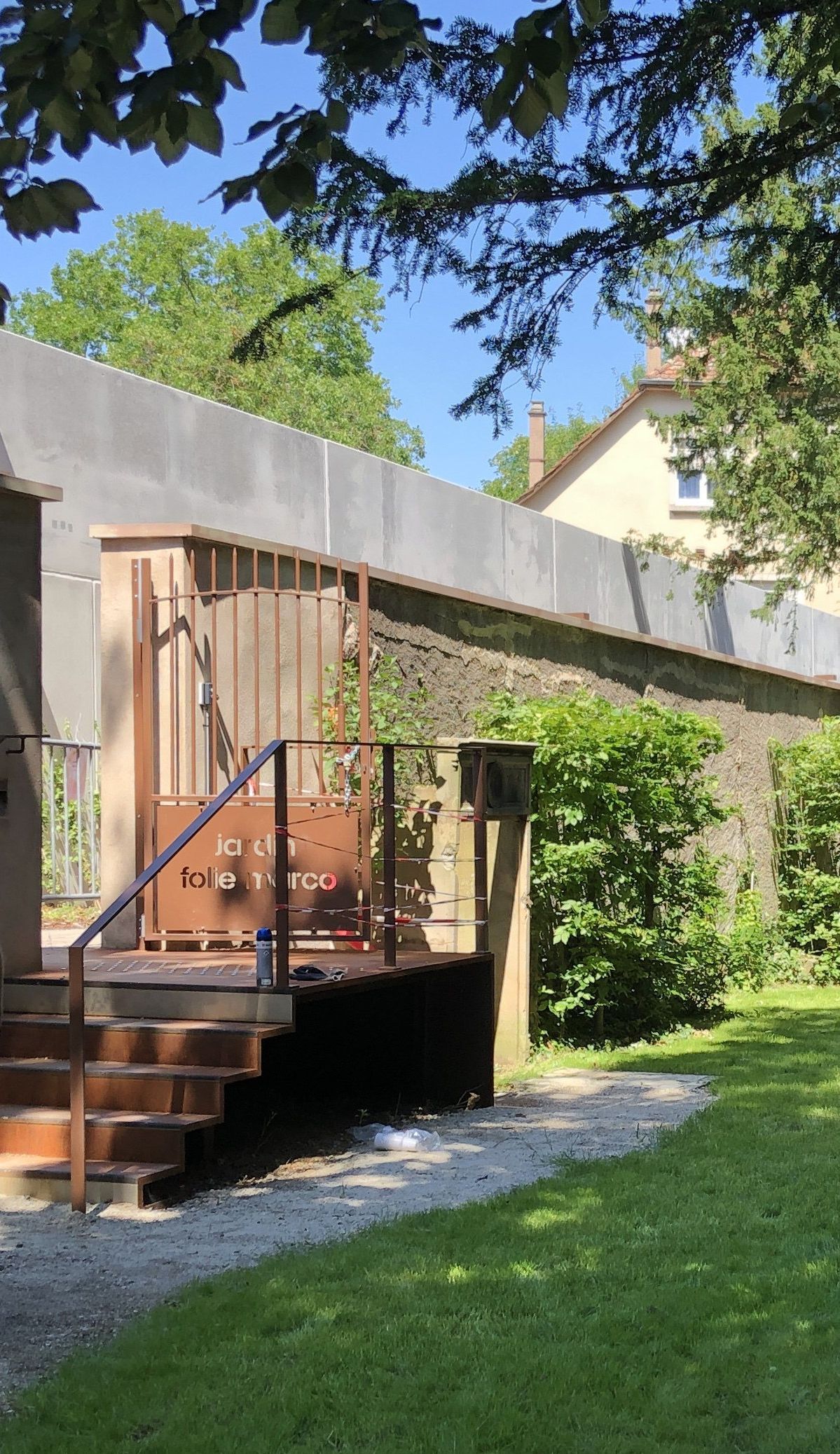 La liaison via le parc de la Folie Marco se fait en décalé par rapport à l’axe de symétrie du musée : le percement réalisé au centre du mur du parc de la Folie Marco offre une vision partielle sur le jardin et accompagne le piéton dans une promenade « romantique » en continuité de l’aménagement existant (pas d’allée rectilignes, pas de perception de l’ensemble du jardin). La différence de niveau entre intérieur et extérieur du parc est gérée par un escalier en métal, pièce rapportée qui respecte le nivellement originel du jardin. Le portillon d’accès est traité comme une entrée arrière : en acier corten déployé, à l’identique des portes du parking en ouvrage.