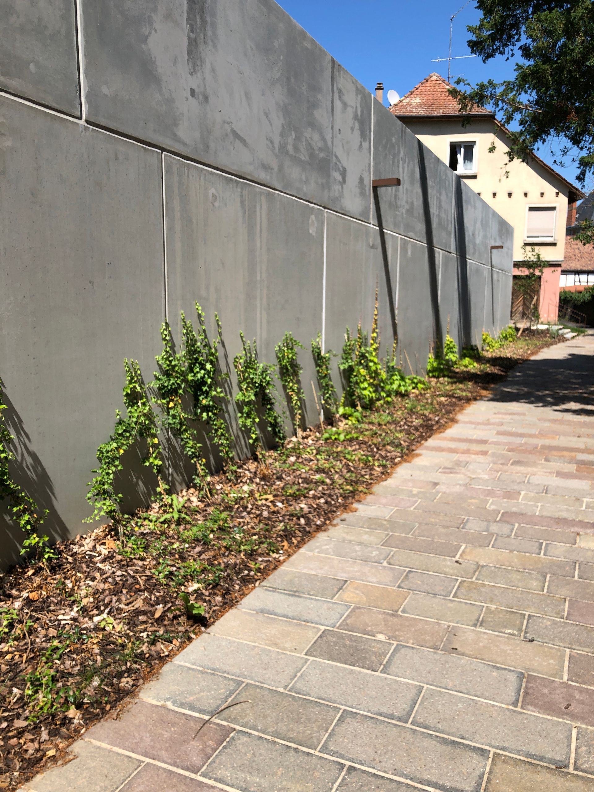 Le long du chemin piéton, après la brèche formée par l’escalier extérieur, la façade est réalisée en béton préfabriqué sur une matrice de « planchettes de bois » qui rappelle l’ancienne grange et recouverte de vigne vierge.
