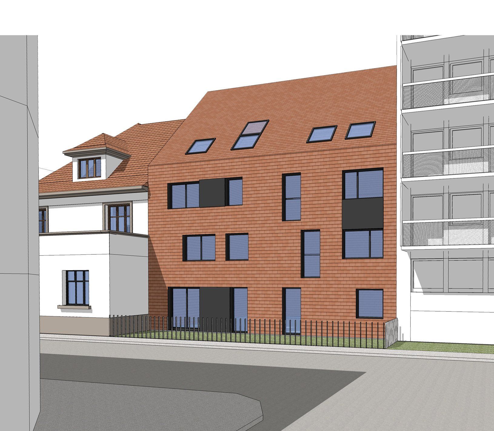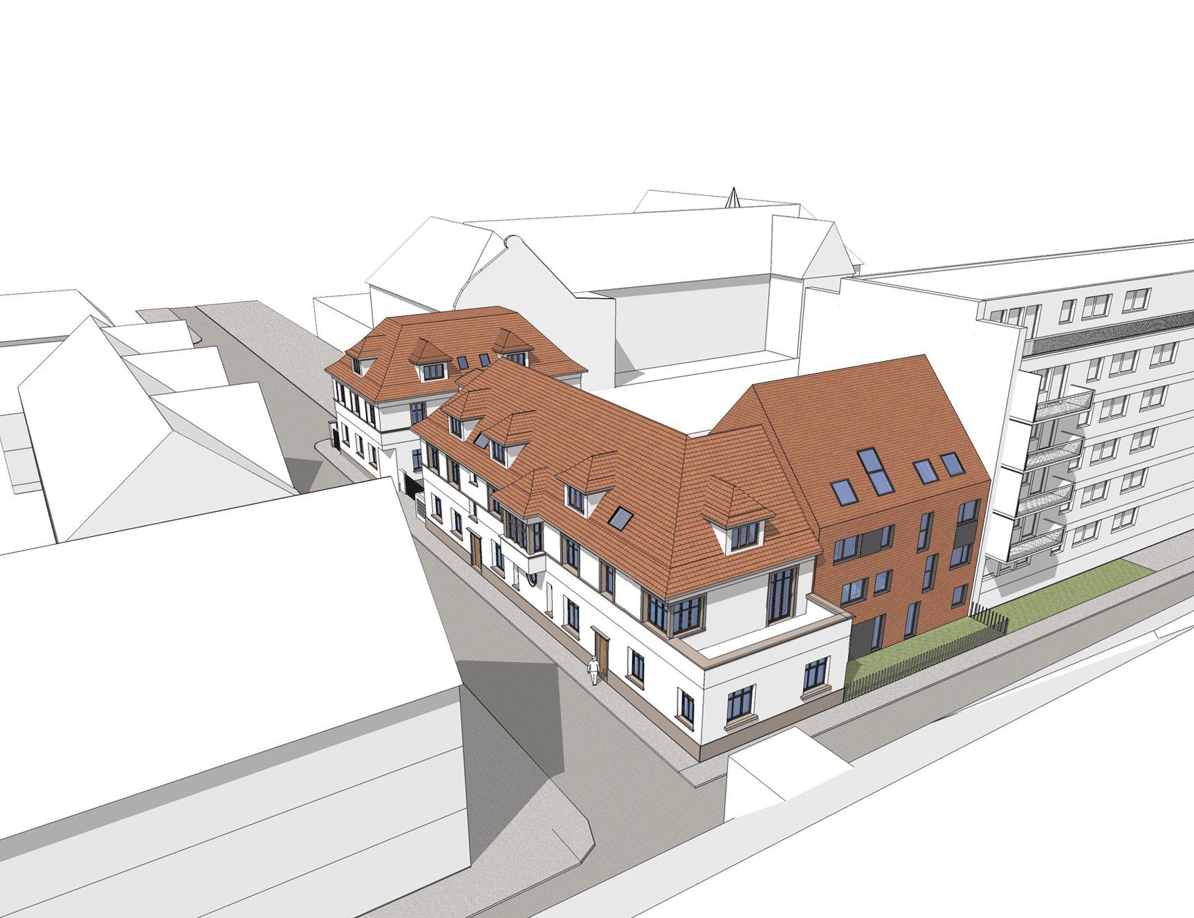 Le projet comprend deux constructions neuves. La première, située en cœur d’ilot, est réalisée à l’identique de l’existant, en rapport avec le gabarit du bâtiment conservé. Une seconde construction neuve sur rue, d’architecture contemporaine, s’implante entre la partie existante rue St Erhard et le pignon aveugle de la construction voisine.