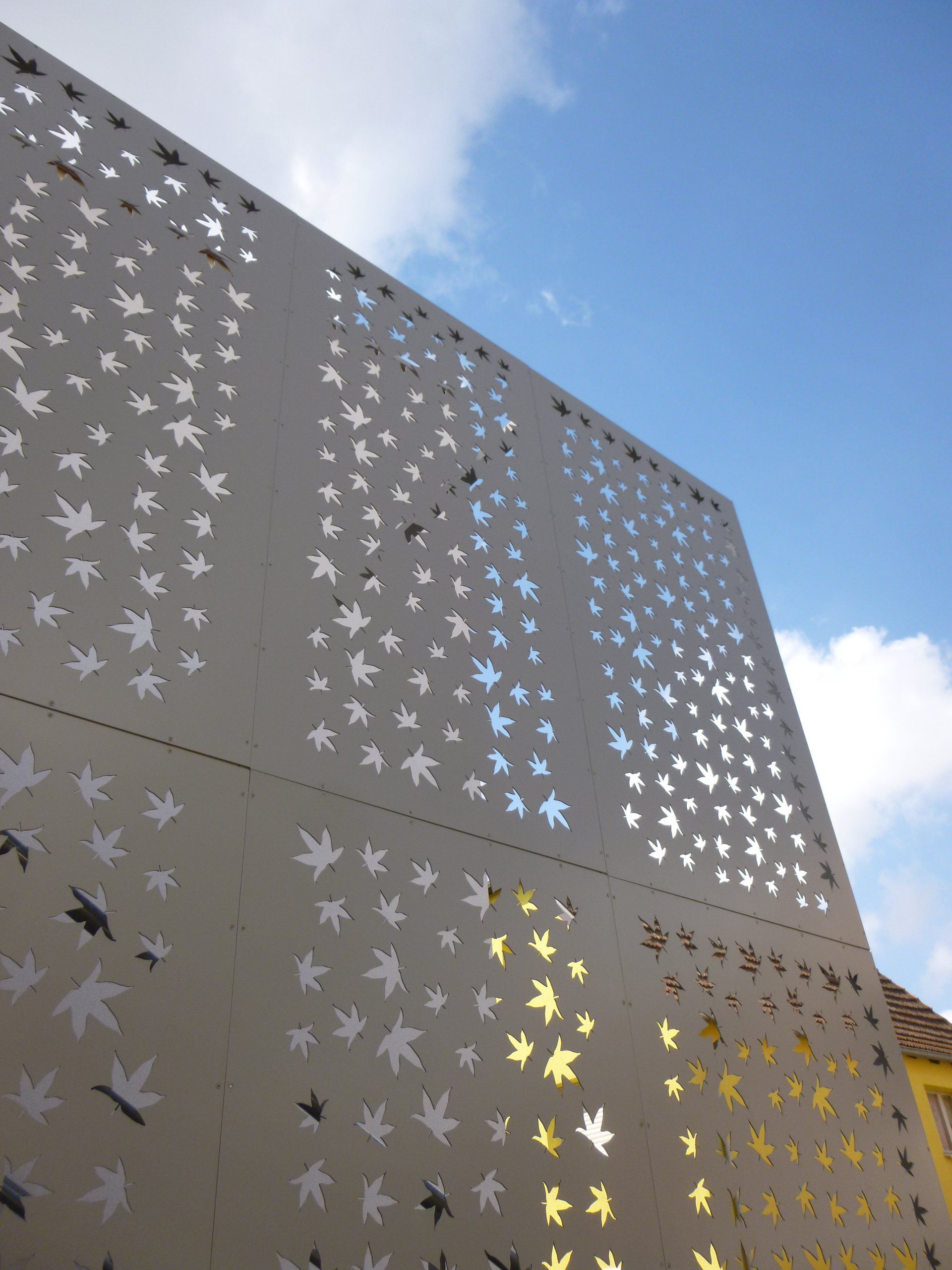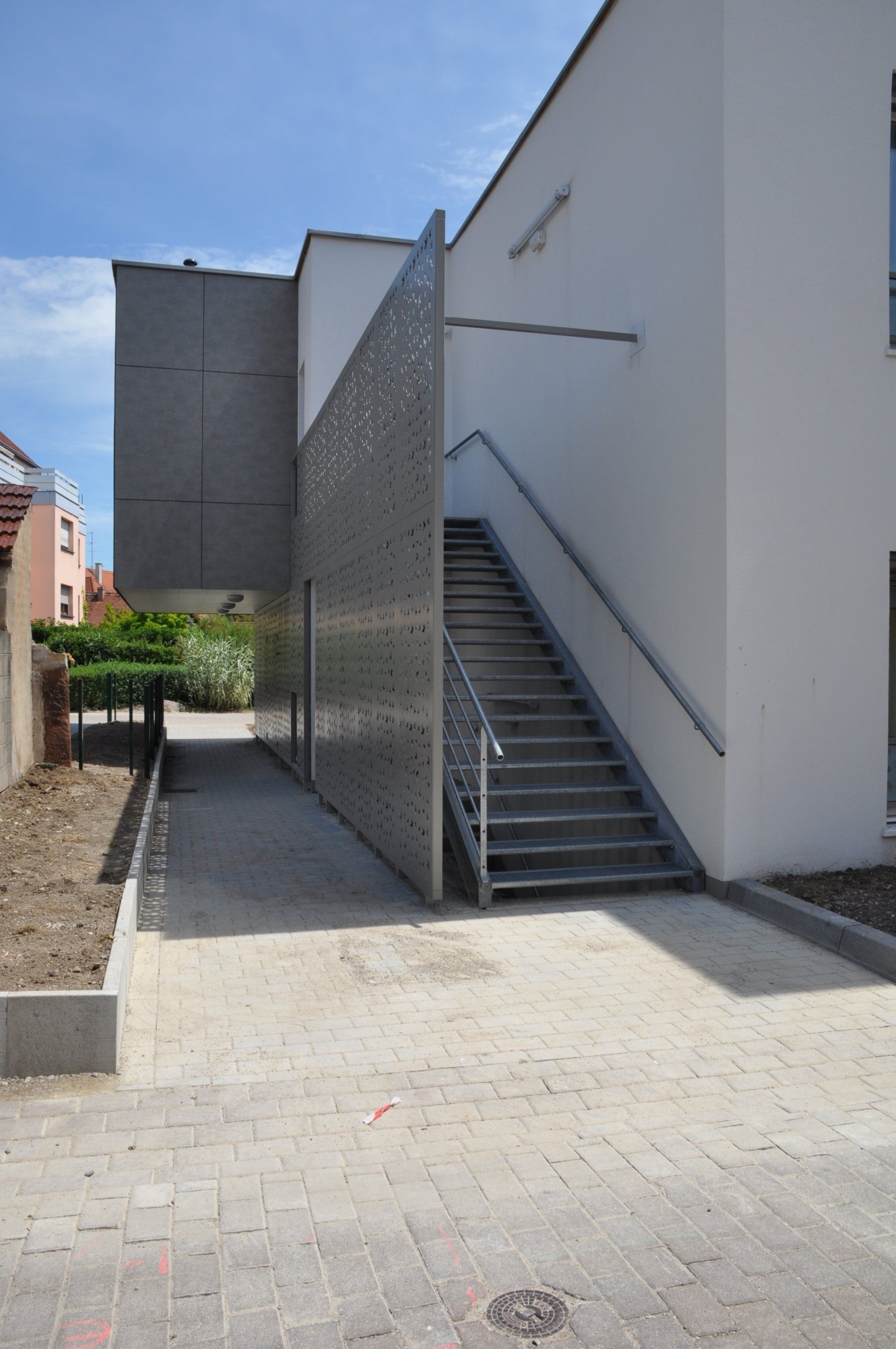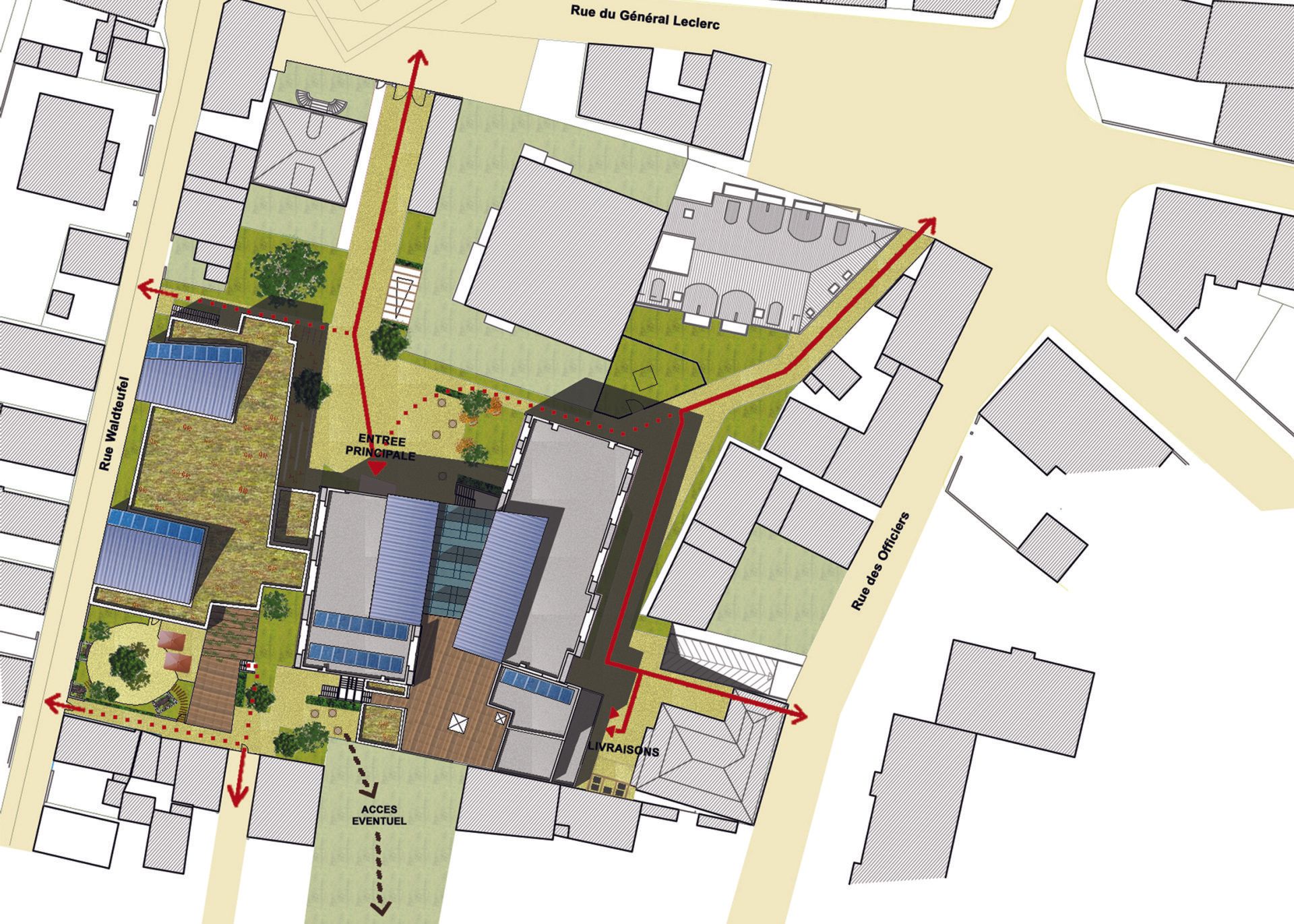 L’extension occupe l’espace linéaire situé le long de la Rue Waldteufel sur deux niveaux droits. La construction est implantée de façon aléatoire, soit en retrait de 2 mètres, soit à l’alignement de la rue. Sur la partie SUD, la construction s’implante en retrait de 15 mètres, recréant ainsi un ordonnancement de pleins et de vides, déjà existant sur le site.